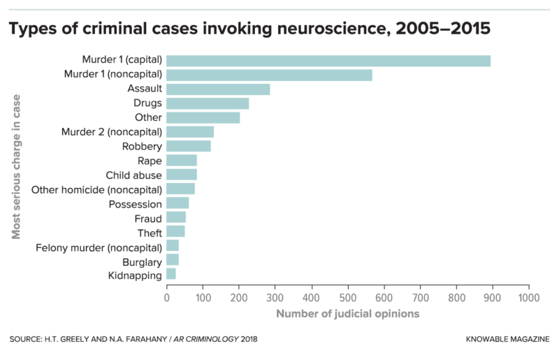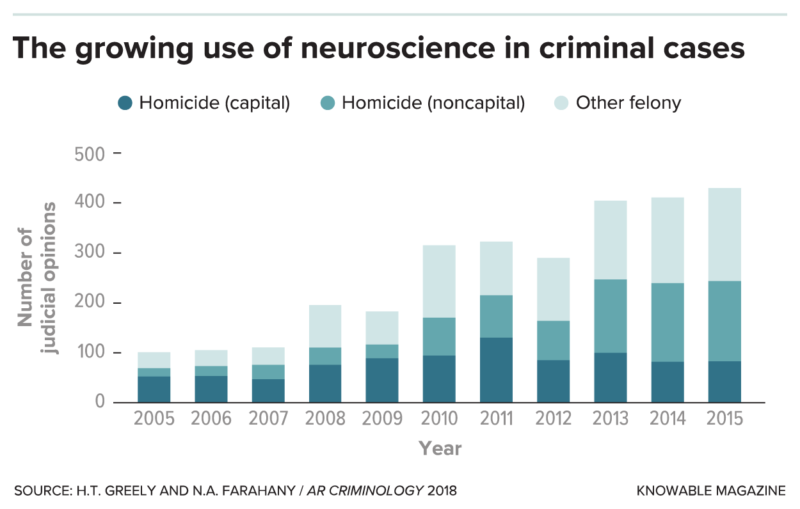 Alcuni studiosi hanno cercato di quantificare la frequenza con cui la neuroscienza ha fatto ingresso nei procedimenti penali. Un’analisi del 2015 di Denno ha identificato 800 casi criminali in cui è stato fatto ricorso alle neuroscienze, in un arco temporale di vent’anni. Ha anche registrato un incremento nell’uso delle prove neuroscientifiche di anno in anno, in linea con quanto emerso in uno studio del 2016 di Nita Farahany, studiosa di etica e diritto alla Duke University.