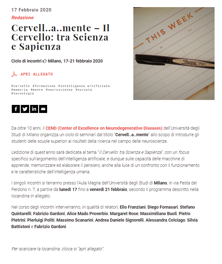 Da oltre 10 anni, il CEND (Center of Excellence on Neurodegenerative Diseases) dell’Università degli Studi di Milano organizza un ciclo di seminari dal titolo “Cervell..a..mente” allo scopo di introdurre gli studenti delle scuole superiori ai risultati della ricerca nel campo delle neuroscienze.