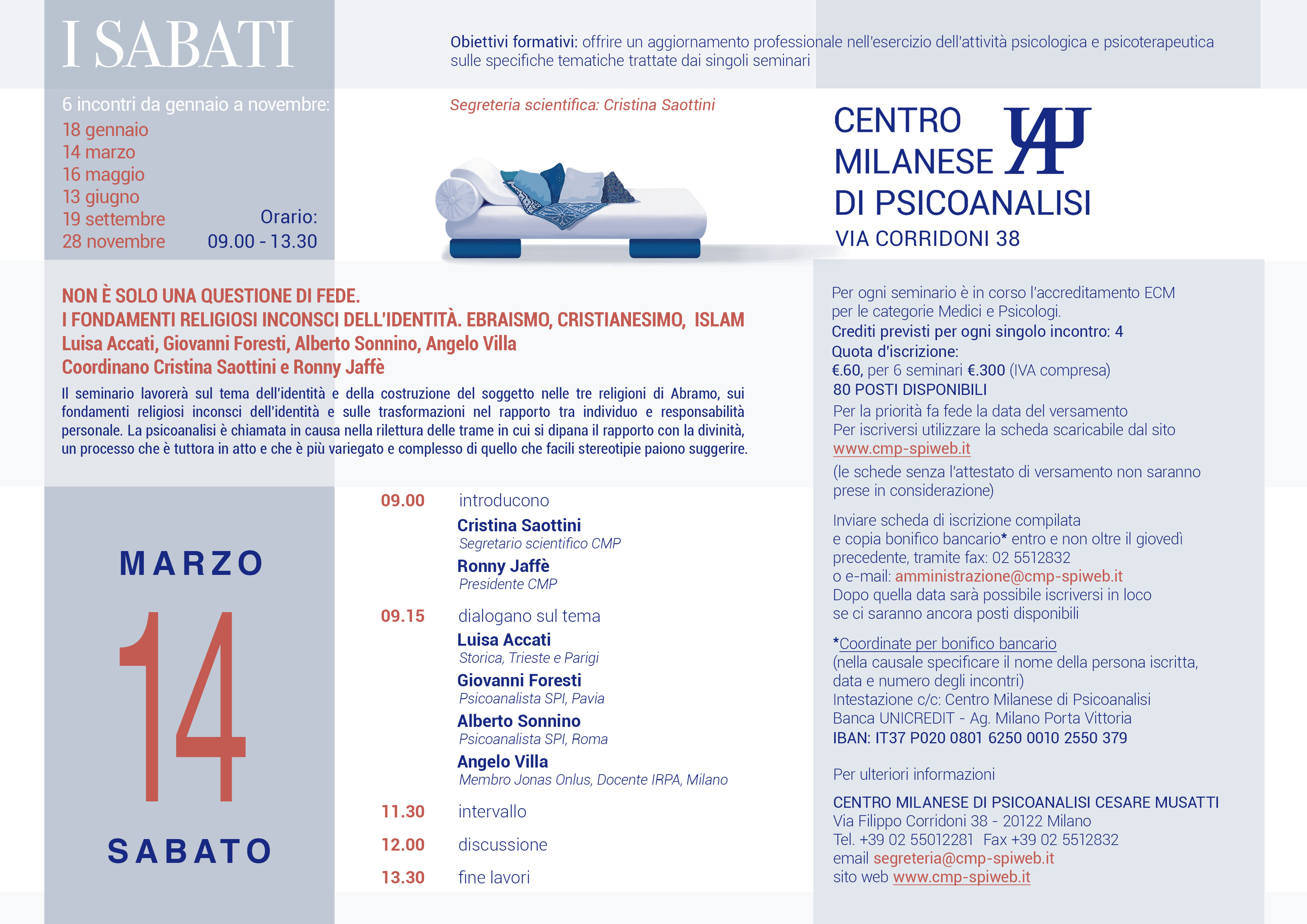 Il Centro Milanese di Psicoanalisi “C. Musatti”, nell’ambito dell’inziativa “I Sabati”, propone un seminario di studi in tema di “Fondamenti religiosi inconsci dell’identità: ebraismo, cristianesimo, islam“.