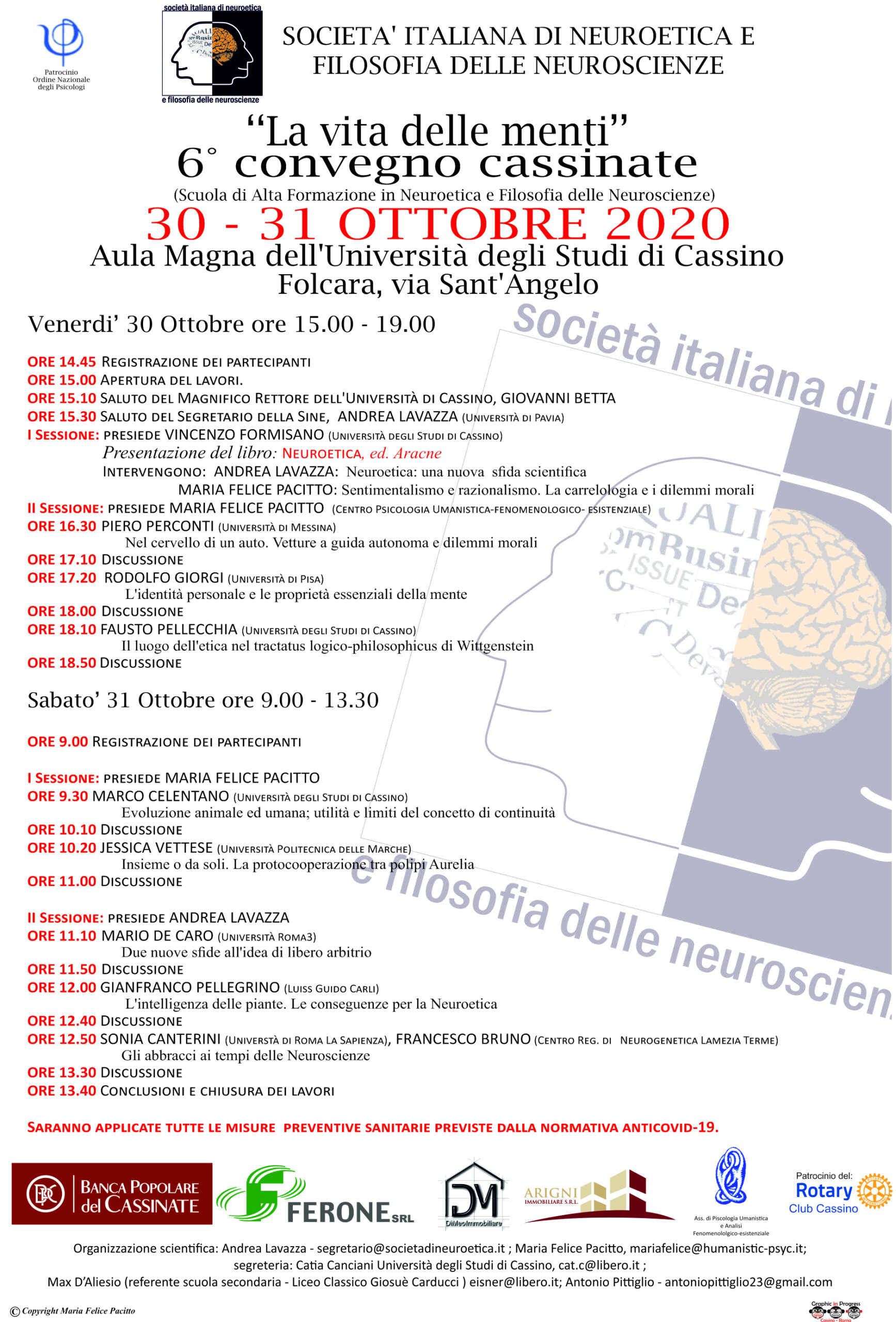 Nel pomeriggio di venerdì 30 e nella mattinata di sabato 31 ottobre, si terrà la VI edizione del Convegno Cassinate di Neuroetica e Filosofia delle Neuroscienze organizzato dalla Società italiana di neuroetica (SINe), dedicata al tema “La vita delle menti“.